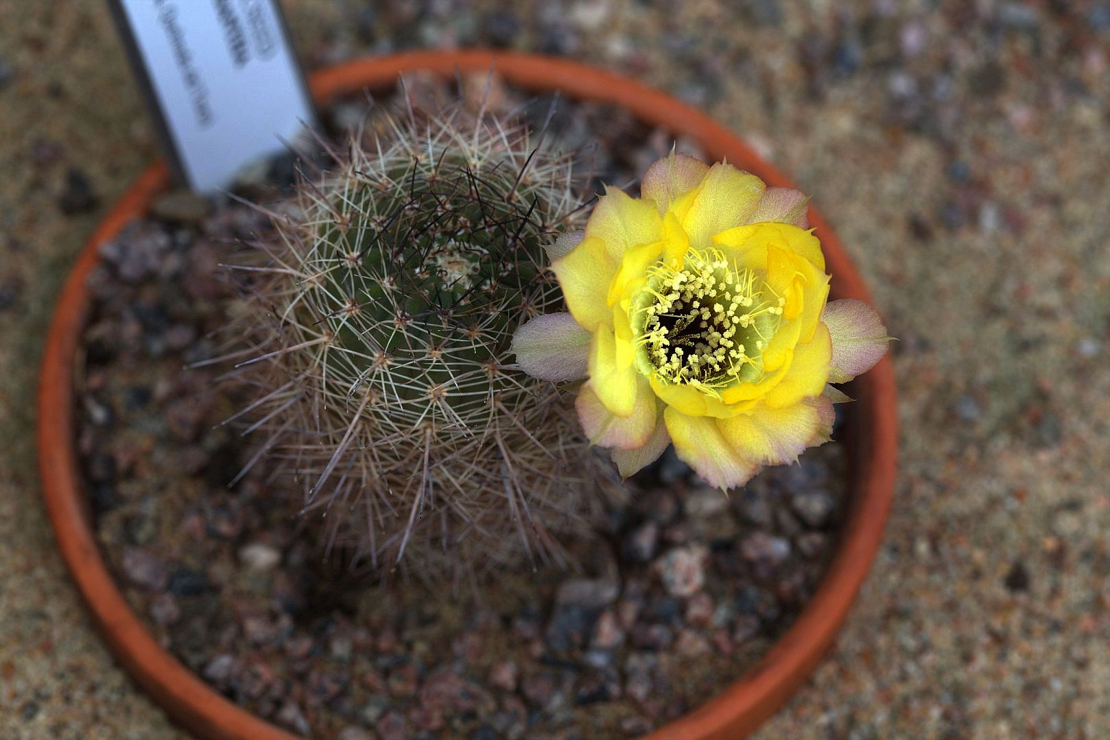 Die darauf befindlichen Areolen stehen etwa 1,5 Zentimeter voneinander entfernt. Aus ihnen entspringen rötlich braune Dornen, die im Alter vergrauen. Mitteldornen werden nicht ausgebildet. Die fünf bis sieben (selten ab drei) seitlich ausstrahlenden Randdornen weisen eine Länge von bis zu 2 Zentimeter auf. Die breit trichterförmigen Blüten erscheinen seitlich an den Trieben und öffnen sich am Tag.