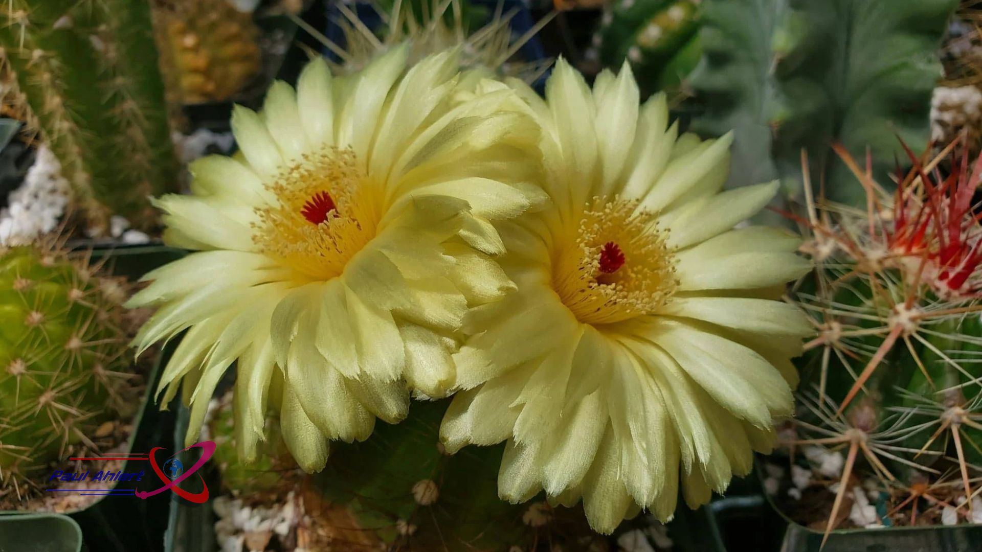Die ein bis vier Mitteldornen sind bräunlich, rötlich braun oder gelblich und weisen eine Länge von 0,8 bis 4 Zentimeter auf. Die vier bis 15 Randdornen sind weißlich bis gelblich oder bräunlich und 0,5 bis 3 Zentimeter lang. Die in der Regel gelben Blüten, nur sehr selten sind sie orangerot oder rot, erreichen Längen von 5 bis 6 Zentimeter. Ihre Blütenröhre ist mit bräunlicher Wolle und Borsten besetzt.