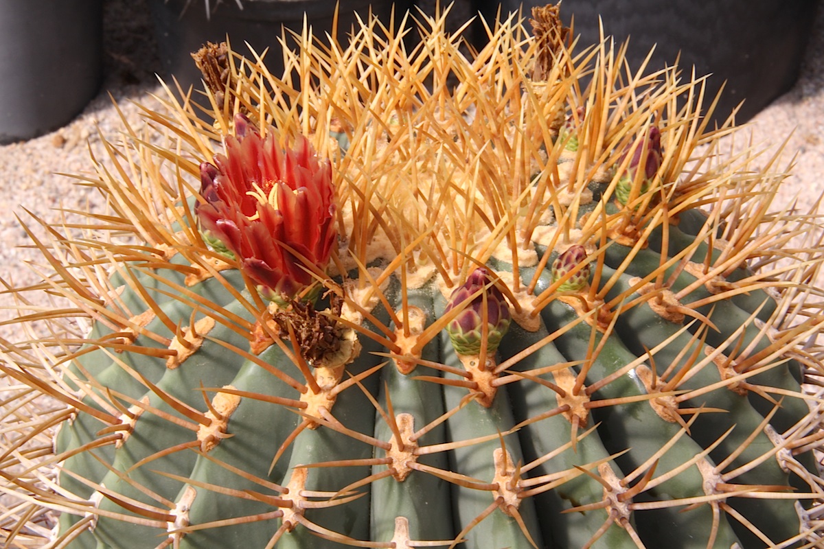 Beschreibung: Ferocactus diguetii wächst einzeln mit säulenförmigen Trieben und erreicht bei Durchmessern von 40 Zentimetern Wuchshöhen von bis zu 4 Meter. Es sind 25 bis 35 Rippen vorhanden, die bis zu 3 Zentimeter hoch sind und im Alter wellig werden. Die vier bis acht, bis zu 5 Zentimeter langen Dornen sind reingelb bis rötlich grau und lassen sich nicht in Mittel- und Randdornen unterscheiden.