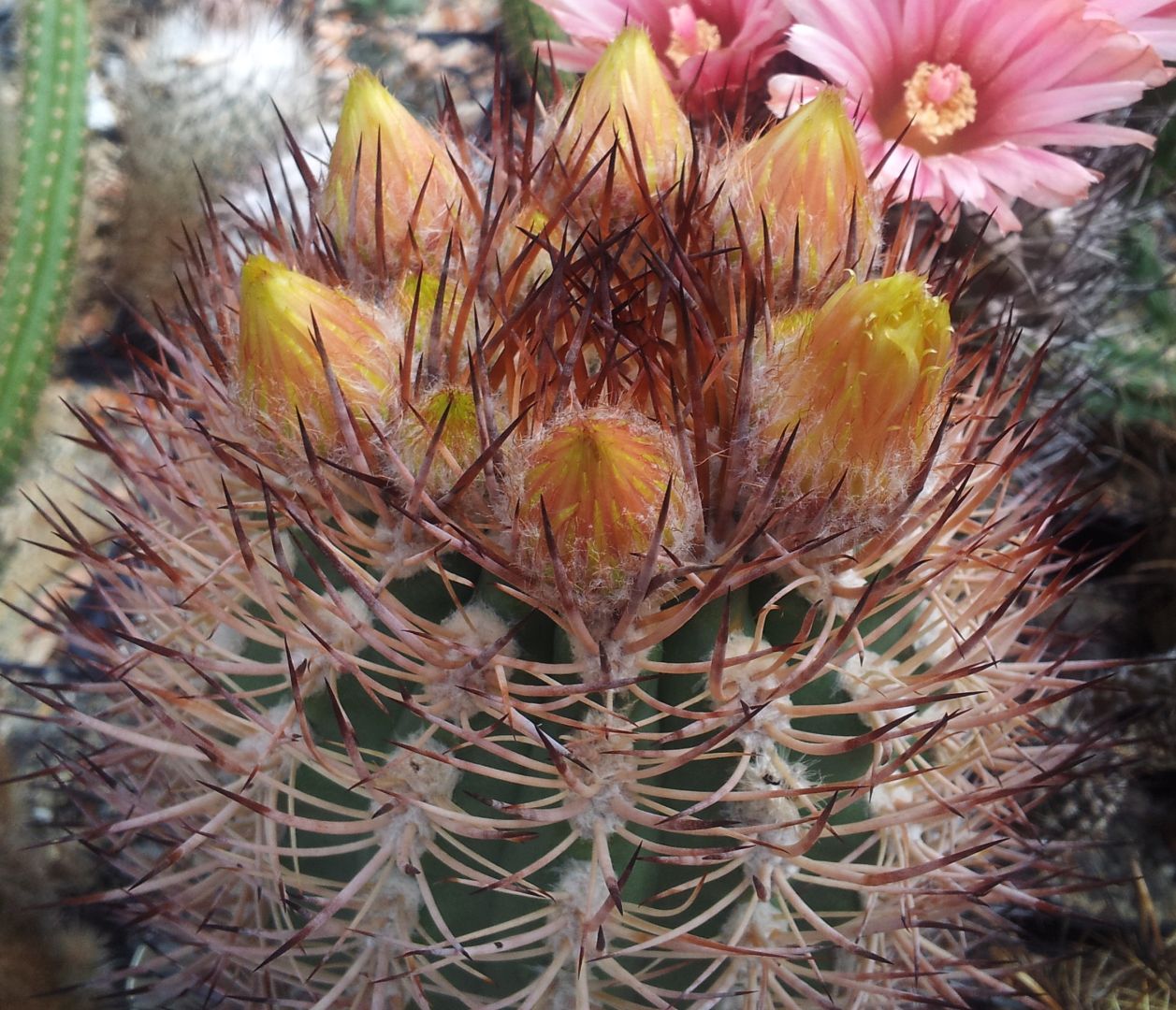 Die trichterförmigen Blüten sind an ihrer Mündung verengt. Sie erscheinen aus älteren Areolen und sind strohgelb mit einem rötlichen Schlund. Die Blüten sind bis 2,5 Zentimeter lang und weisen einen Durchmesser von 2 Zentimeter auf. Ihr Perikarpell und die Blütenröhre sind mit Wolle und gelegentlich auch Borsten besetzt. Die kurz eiförmigen Früchte reißen an einer basalen Pore auf.