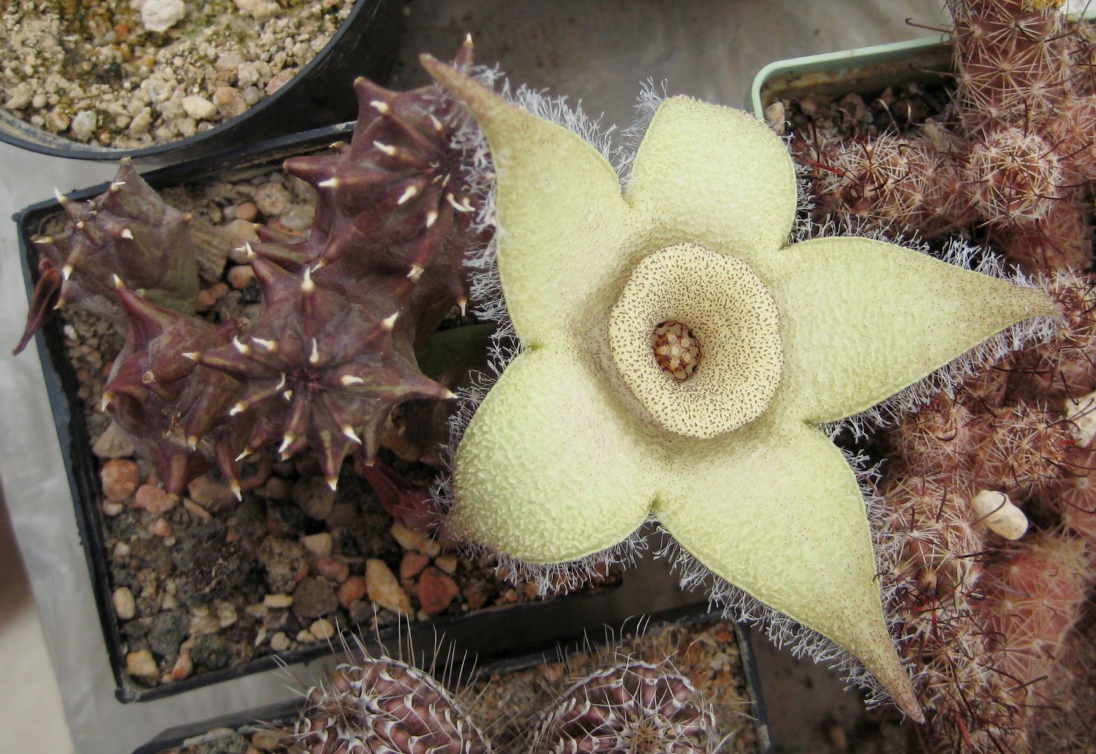 Die zwittrigen Blüten sind fünfzählig und bei einem Durchmesser von 7 bis 8 Zentimeter radiärsymmetrisch sowie flach schüsselförmig ausgebreitet. Sie haben. Die fünf Kelchblätter sind 6 bis 8 mm lang, 3 mm breit und konvex gewölbt. Die fünf Kronblätter sind basal verwachsen, der zentrale Teil trichterförmig. Die Kronröhre ist basal abgeflacht und von einem Annulus (ringartige Struktur) umgeben. Der bis 8 mm hohe, recht massiv und breit trichterförmige Annulus besitzt einen verdickten, abgespreizten, leicht nach außen umgebogenen Rand. Gelegentlich sind sehr stumpfe Zipfel angedeutet. Die kurzen purpurroten Haare sind kurz und steif. Die lanzettlichen Kronblattzipfel messen 3 bis 3,2 cm in der Länge und 1,4 bis 1,7 cm in der Breite. Die außen glatten, innen mehr oder weniger dicht warzig-papillösen Kronblattzipfel sind abgespreizt und die Ränder stark nach außen gebogen. Die Papillen sind zur Spitze zu purpurfarben. Die Ränder sind mit weißen, etwa 3 mm langen, einfachen oder abgeflacht keuligen Haaren (Trichomen) besetzt. Diese sind vibratil (schwingungsfähig). Die Krone ist außen blassgrün und fein purpurrot gepunktet, innen blass grünlichgelb und die Trichterbasis purpurrot.