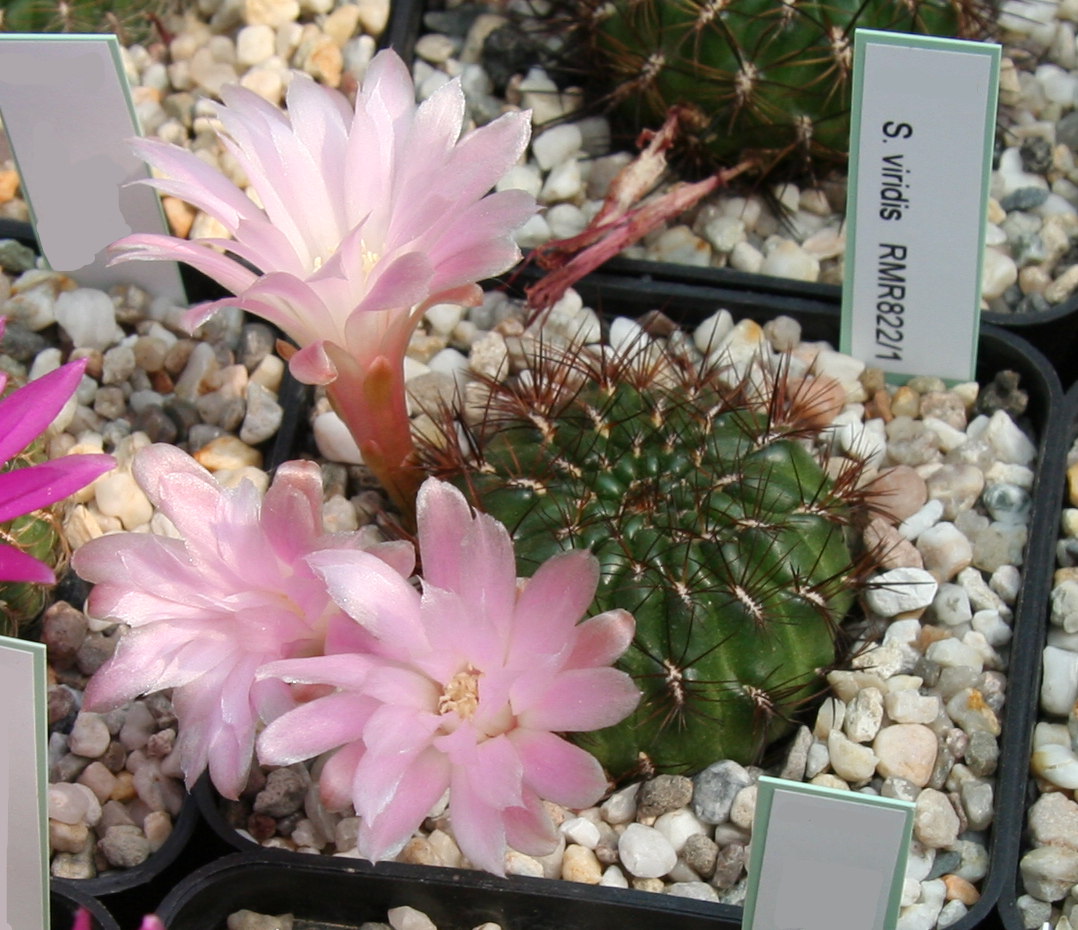 Beschreibung: Sulcorebutia viridis wächst meist einzeln und bildet selten im Alter Seitentriebe. Die flachkugeligen, dunkelgrünen oder hellgrünen Körper erreichen einen Durchmesser von bis zu 8 Zentimeter und bleiben sehr flach. Sie besitzen eine bis zu 8 Zentimeter lange, konisch zulaufende Rübenwurzel. Die 12 Millimeter langen und 5 bis 7 Millimeter breiten Höcker sind derb und flach. Die auf der Oberseite der Höcker angeordneten ovalen Areolen sind 6 bis 7 Millimeter lang und oben 2 Millimeter breit. Die harten bis zu 18 (bis 20) Dornen weisen verschiedene helle Farben auf. Man unterscheidet zwischen den zur Seite gerichteten, anliegenden oder nur wenig vom Körper abstehenden, weißen oder grauen Randdornen und den 3 bis 5 nach oben gerichteten, bis zu 15 Millimeter langen, stechenden weißen bis dunkelbraunen (selten schwarzen) Mitteldornen.