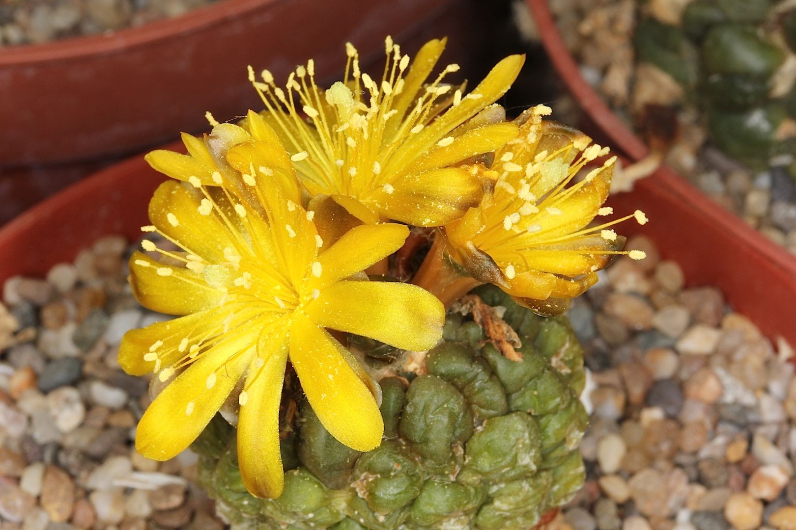 Die radförmigen, gelben Blüten erscheinen aus jungen Areolen nahe dem Scheitel der Pflanzen und haben einen Durchmesser von 3 bis 4 Zentimeter. Die kahlen Früchte sind spindelig geformt und enthalten kleine, schwarze Samen.