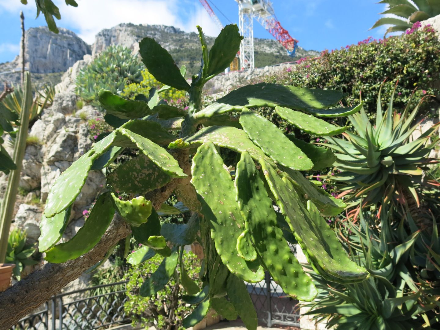 Beschreibung: Consolea macracantha wächst stark verzweigt und erreicht Wuchshöhen von bis zu 3 Meter und mehr. Es wird ein Stamm von bis zu 15 Zentimeter Durchmesser ausgebildet, der mit zahlreichen, abspreizenden, bis zu 15 Zentimeter langen Dornen bewehrt ist. Die glänzend grünen, flachen, glatten Triebabschnitte sind länglich bis eiförmig. Es sind ein bis vier kräftige, pfriemliche Dornen vorhanden, die weißlich und bis zu 15 Zentimeter lang sind. Die Dornen können auch fehlen.