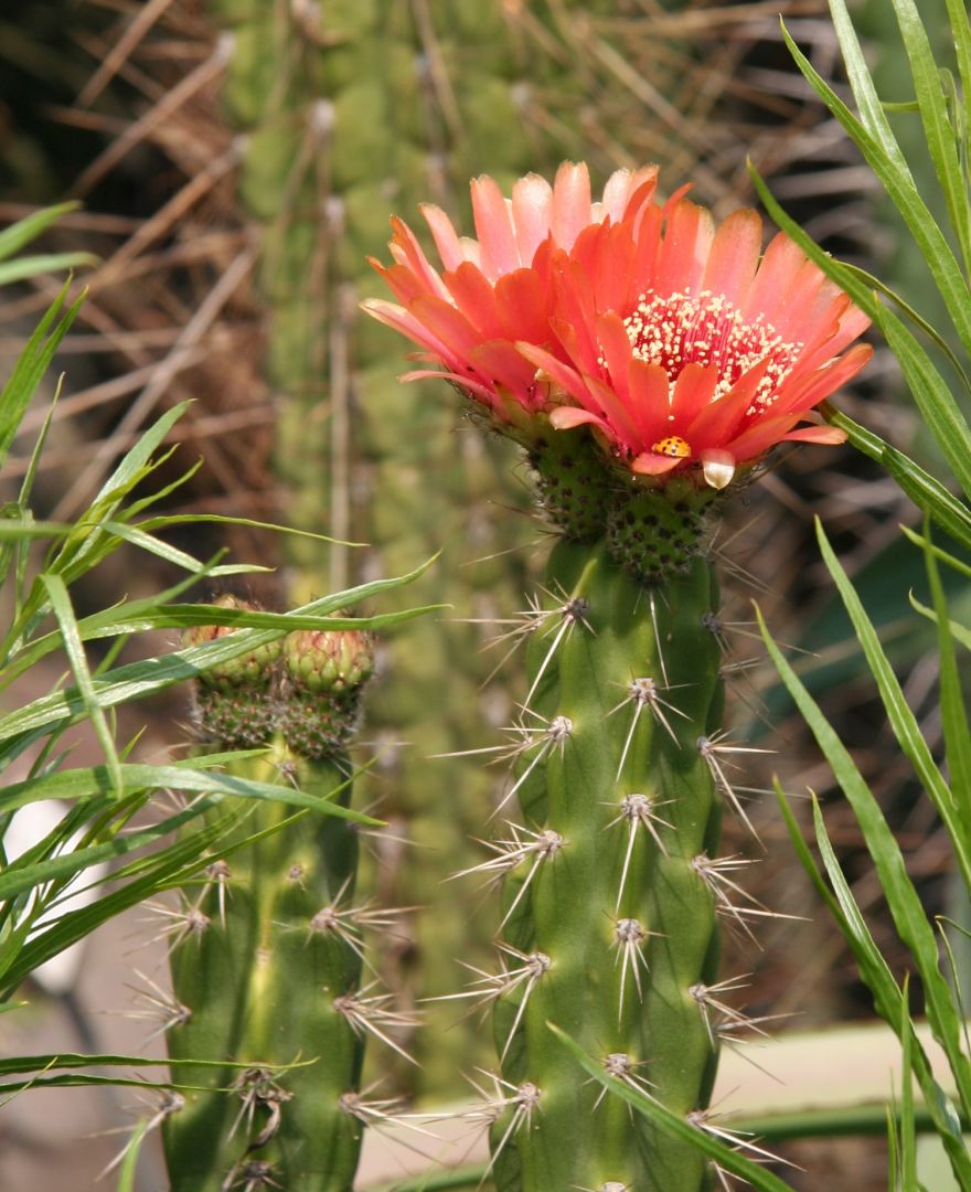 Die etwas purpurroten Blüten sind bis zu 5 Zentimeter lang und weisen Durchmesser von 6 Zentimeter auf. Die kugelförmigen, weichen, bedornten Früchte erreichen einen Durchmesser von 6 Zentimeter.