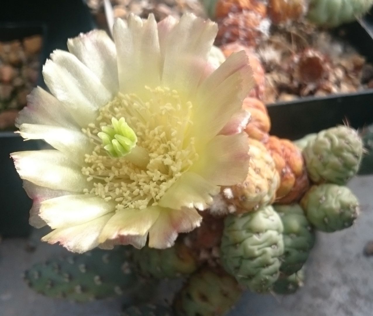 Beschreibung: Maihueniopsis minuta wächst klein und kompakt, ist reich verzweigt und häufig teilweise im Boden vergraben. Die eiförmigen, manchmal zur Spitze verjüngten, kaum gehöckerte, häufig etwas purpurn überhauchten Triebabschnitte sind bis zu 2,5 Zentimeter lang. Die kleinen, eng beieinander stehenden Areolen sind eingesenkt und fast auf dem gesamten Triebabschnitt vorhanden. Dornen fehlen in der Regel. Manchmal sind ein bis zwei borstenartige, plötzlich zurückgebogene Dornen von 7 bis 12 Millimeter Länge vorhanden.