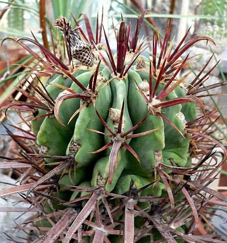 Beschreibung: Die Arten der Gattung Ferocactus sind flachrunde, kugelförmige oder zylindrische Stammsukkulenten. Sie stehen meist einzeln oder verzweigen basal. Stark verzweigende Arten bilden große polsterartige Gruppen von mehreren hundert Köpfen. Die auf den elf bis 30 (bis 60) häufig gehöckerten (bei Jungpflanzen fast in Warzen aufgelösten) Rippen stehenden Areolen tragen kräftige Dornen, die gelb bis kräftig rot, im Alter braun und dann grau gefärbt sind. Die Randdornen sind meist strahlenförmig abgespreizt, die Mitteldornen sind auffälliger und größer, gerade oder hakenförmig, häufig abgeflacht und quer geringelt.