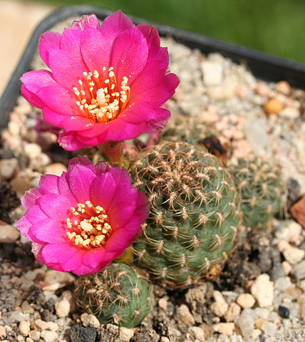 Die trichterförmigen oder glockig-trichterförmigen Blüten sind leuchtend violett, gelb oder rot gefärbt, häufig auch geflammt, aber nur selten weiß. Sie erscheinen häufig aus älteren Areolen an der Basis der Triebe. Ihr Perikarpell und die Blütenröhre sind mit einigen derben, auffälligen Schuppen bedeckt und ansonsten in der Regel kahl.