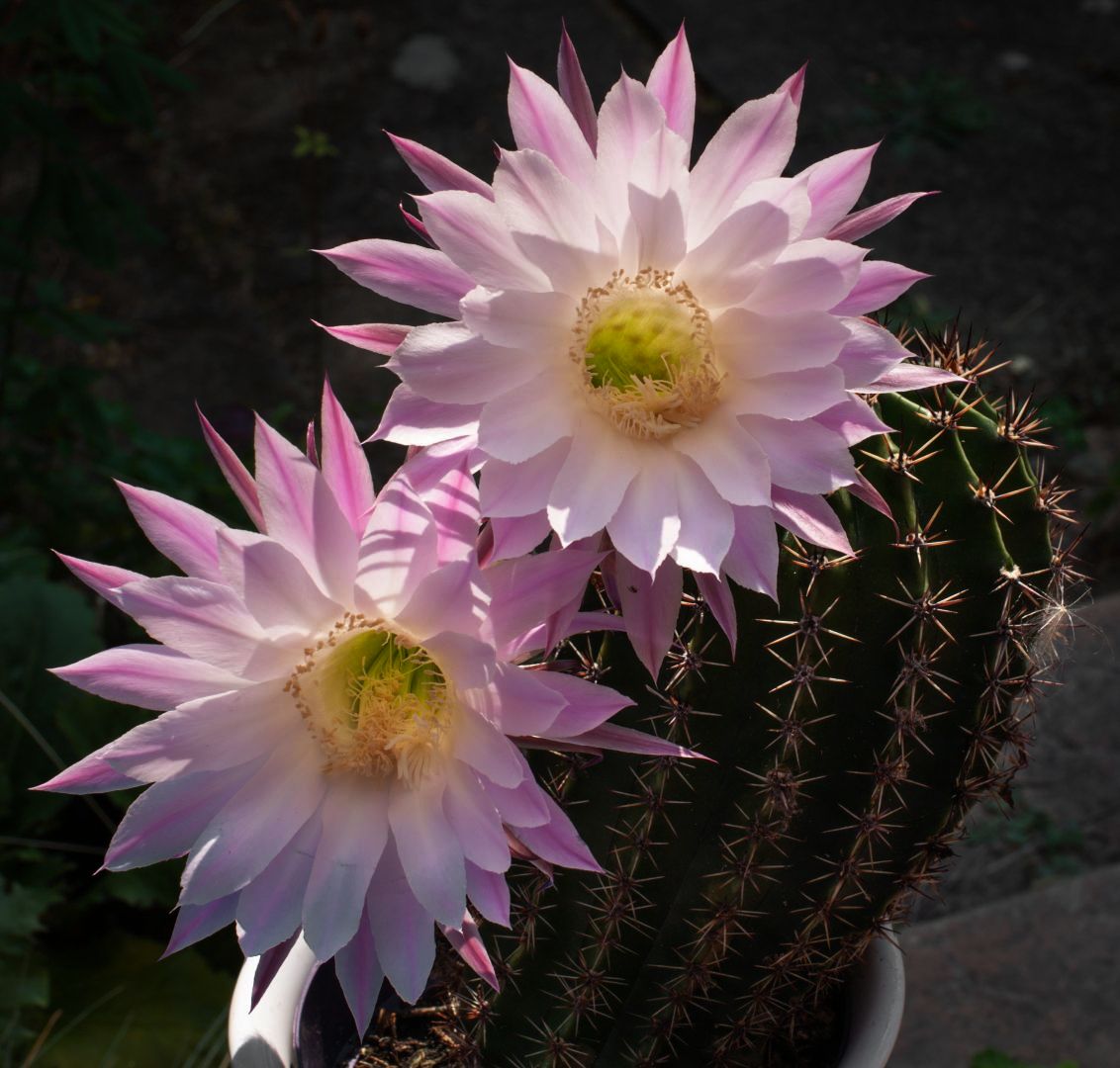 Aus ihnen entspringen hornfarbene, ausgebreitete Dornen die an ihrer Spitze etwas dunkler sind. Die ein bis fünf dicken, nadelförmigen Mitteldornen, die gelegentlich auch fehlen können, sind bis zu 3 Zentimeter lang. Die etwas nadeligen 3 bis 15 Randdornen werden bis zu 2,5 Zentimeter lang. Die lang trichterförmigen, duftenden, hellrosa- bis lavendelfarbenen Blüten öffnen sich in der Nacht. Sie werden bis zu 22 Zentimeter lang. Die grünen Früchte sind bis zu 4 Zentimeter lang und weisen einen Durchmesser von 2 Zentimeter auf.