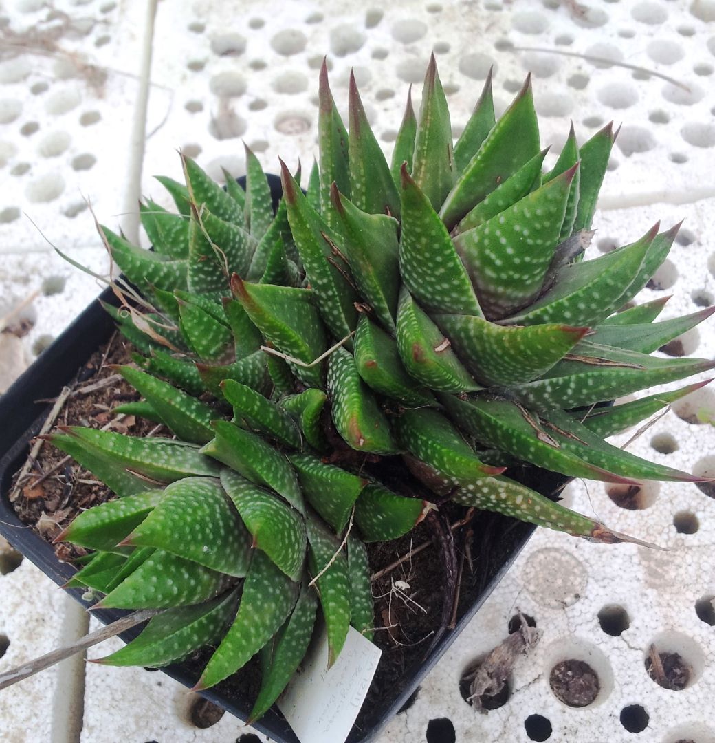 Beschreibung: Haworthia kingiana wächst stammlos und sprosst langsam. Die verschmälerten, ausgebreiteten, lanzettlich-dreieckigen Laubblätter bilden eine Rosette mit einer Höhe von bis zu 18 Zentimetern. Die gelblich grüne Blattspreite ist bis zu 16 Zentimeter lang und 1,8 Zentimeter breit.
