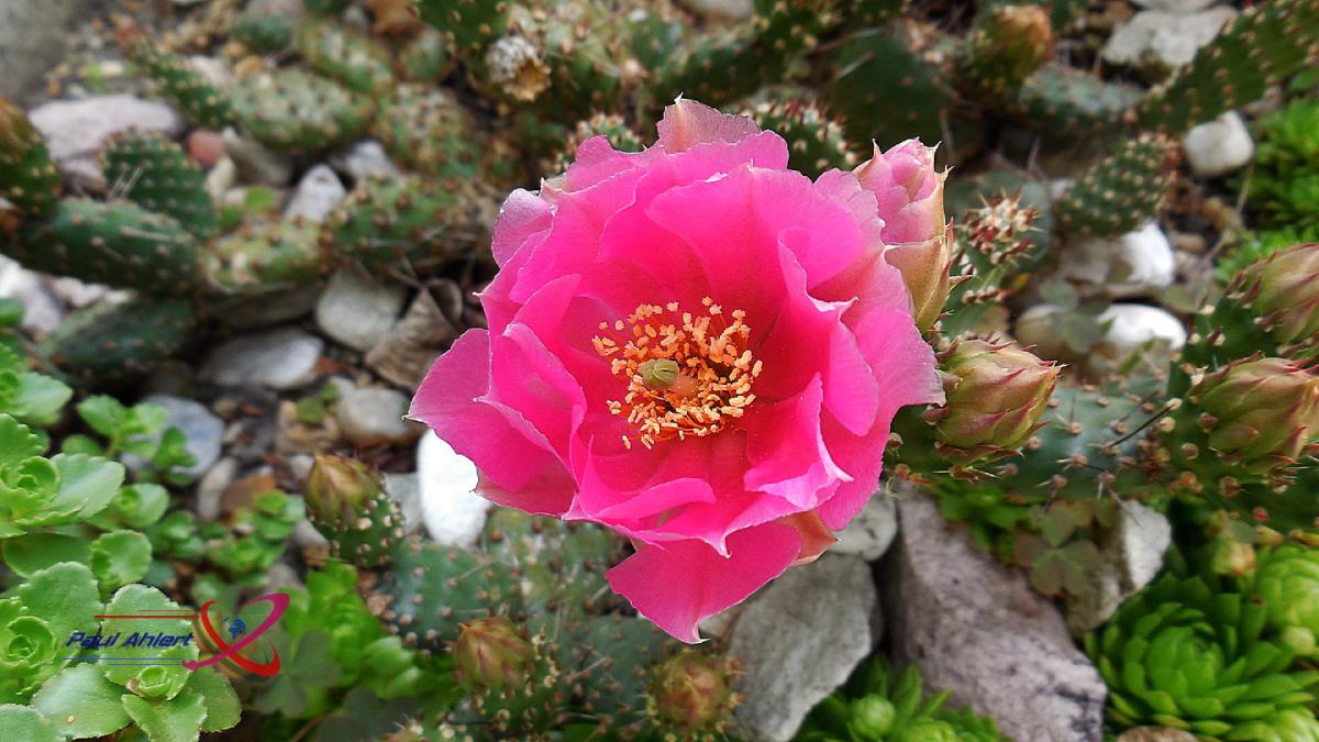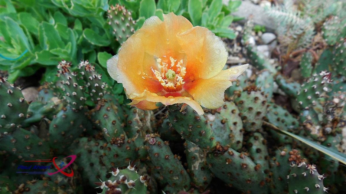 Die Pink, Gelben, selten weißen, Blüten erreichen eine Länge und einen Durchmesser von 5 bis 7,5 Zentimeter. Die grünen, bei Reife trockenen, Früchte sind dornenlos. Sie weisen eine Länge von 2,5 bis 3 Zentimeter und einen Durchmesser von 1,5 bis 2,2 Zentimeter auf.
