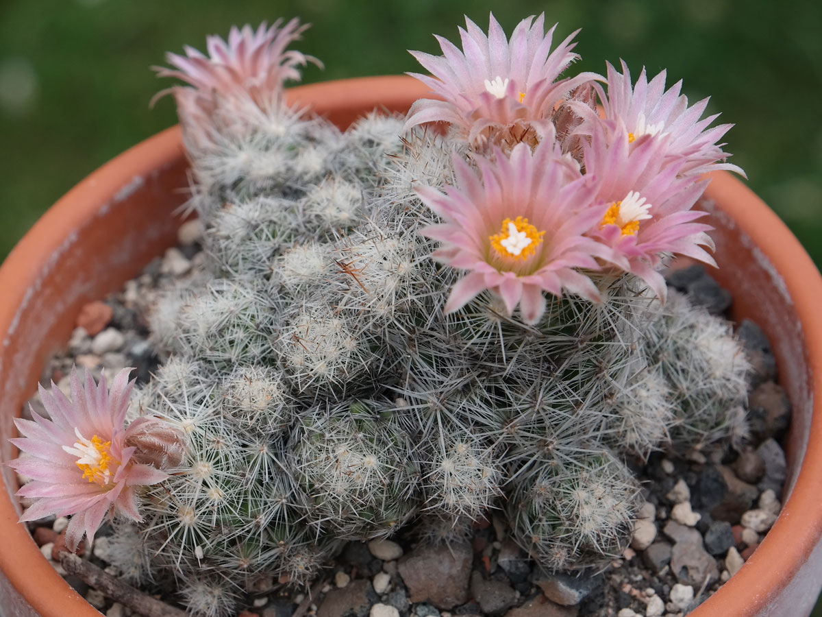 Beschreibung: Die vielsprossigen Pflanzen sind gewöhnlich verzweigt und bilden große Polster. Die zylindrischen, dicht mit Dornen bedeckten Stämme erreichen Wuchshöhen zwischen 2,5 und 7,5 Zentimeter bei einem Durchmesser von 1,2 bis 2,5 Zentimeter. Die Warzen sind bis 2 Millimeter lang. Die 6 bis 9 aufrechten, weißen Mitteldornen sind 4,5 bis 9 Millimeter lang. Die 25 bis 25 Randdornen sind aufrecht und weiß. Sie werden 4,5 bis 6 Millimeter lang.