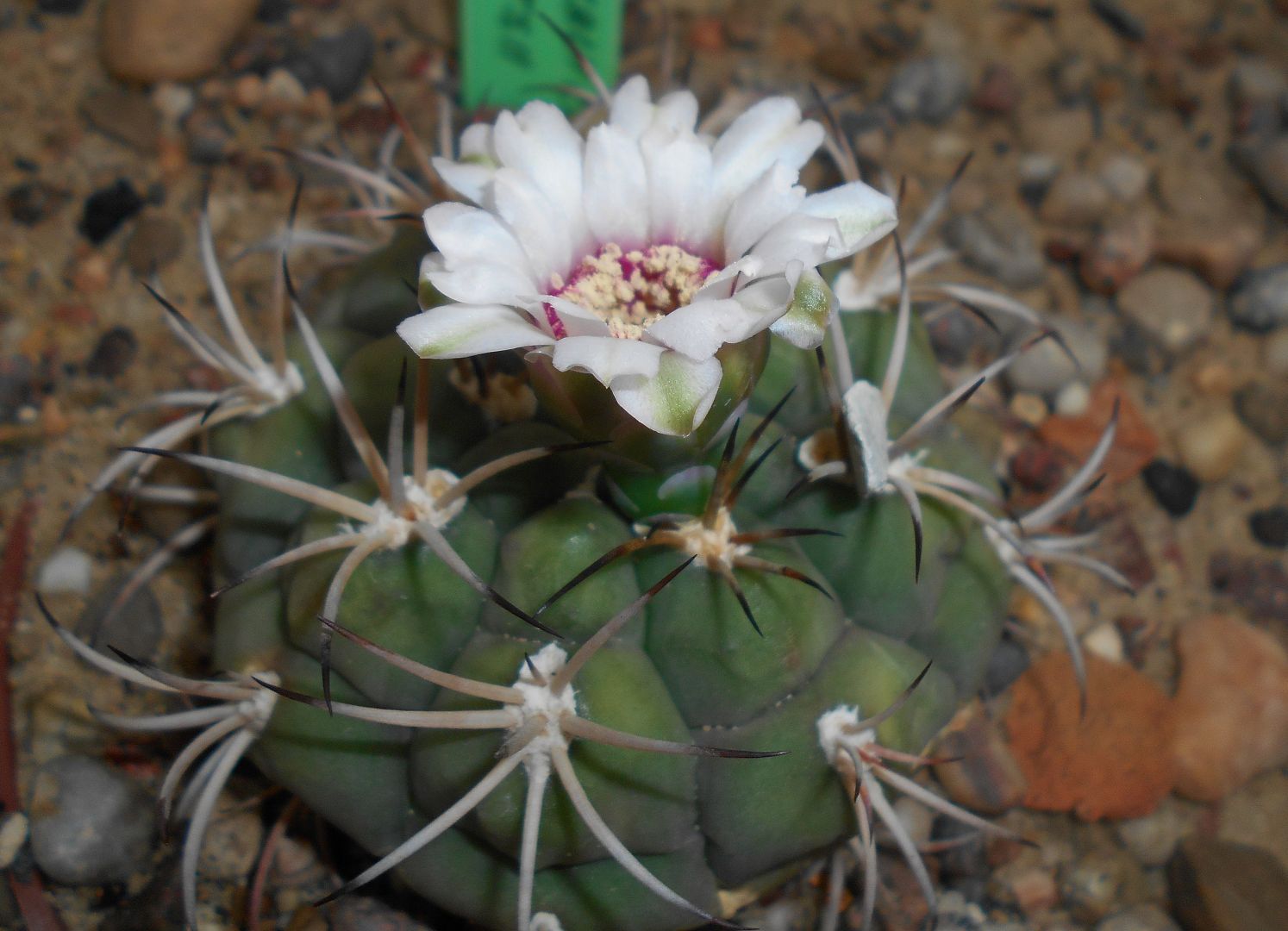 Beschreibung: Gymnocalycium anisitsii wächst einzeln oder gruppenbildend mit hellgrünen, oft rötlich oder violett überhauchten, kugelförmigen bis kurz säulenförmigen Trieben und erreicht bei Durchmessern von bis zu 8 Zentimeter Wuchshöhen von bis zu 10 Zentimeter und mehr. Die acht bis elf Rippen sind spitz gehöckert. Manchmal ist ein Mitteldorn vorhanden, meist fehlt er jedoch. Die fünf bis sieben gelblichen bis bräunlichen Randdornen sind schlank, verdreht und 1 bis 6 Zentimeter lang.