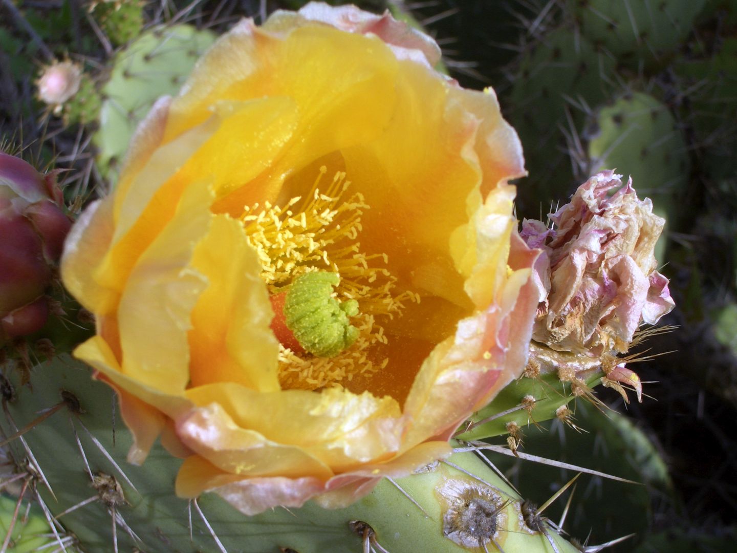 Verbreitung, Systematik und Gefährdung: Opuntia aurea ist in den Vereinigten Staaten in den Bundesstaaten Utah und Arizona in Höhenlagen von 1500 bis 1800 Metern verbreitet.