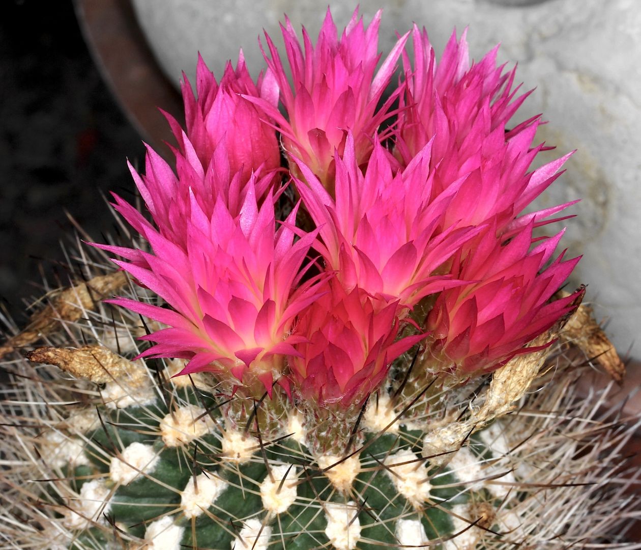 Die karminroten Blüten erscheinen aus jungen Areolen und sind unterschiedlich groß. Manchmal werden pro Areole mehr als eine Blüte ausgebildet. Ihr Perikarpell und die Blütenröhre sind mit Wolle und manchmal Borsten besetzt. Die verlängerten, leuchtend roten Früchte öffnen sich mit einer basalen Pore.