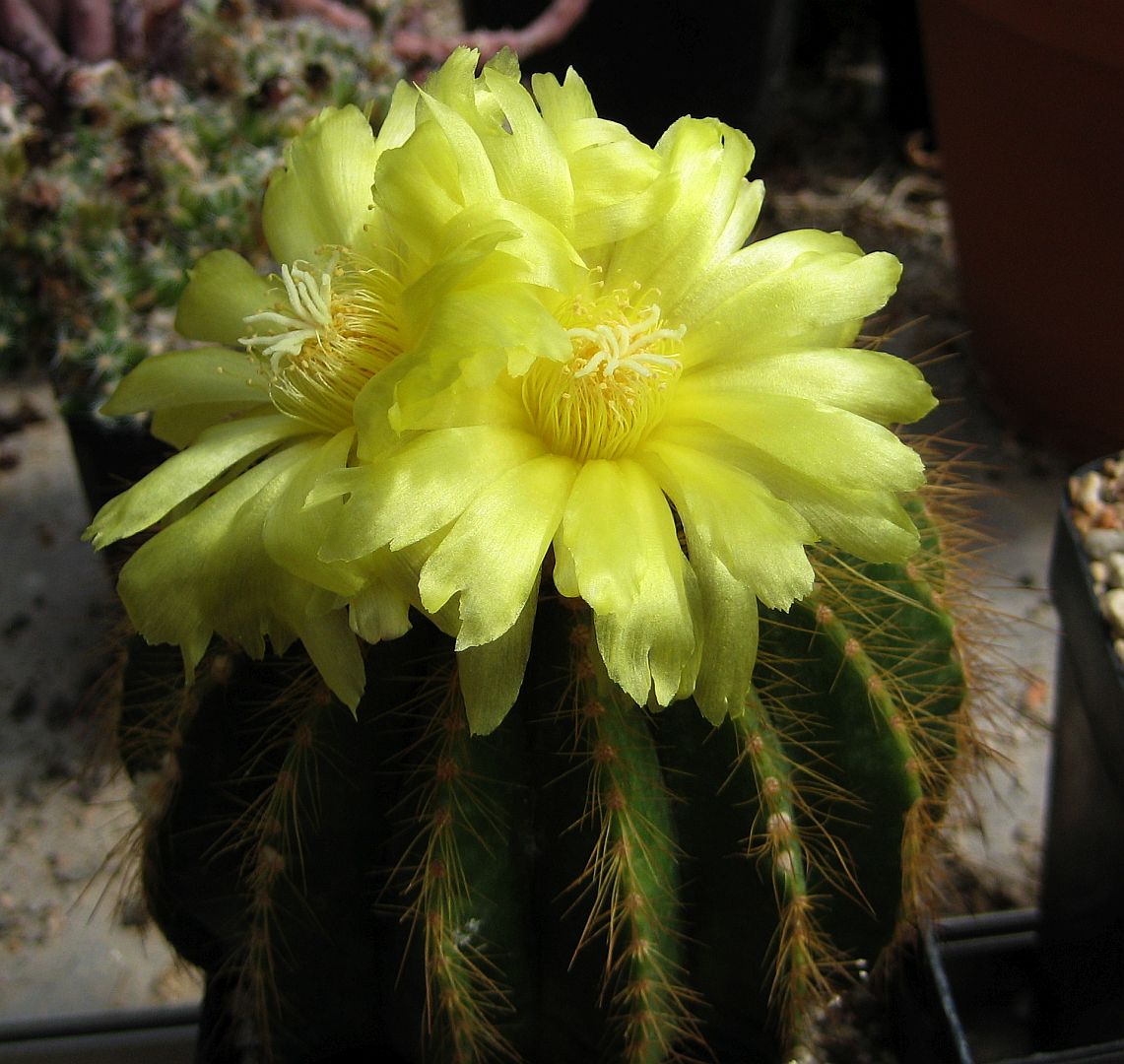 Die Blüten erscheinen in Scheitelnähe. Sie sind gelb und 5 bis 6 Zentimeter im Durchmesser groß. Das Perikarpell ist mit weißer Wolle und mit Borsten besetzt. Die Narbe ist hellgelb. Die Früchte sind tönnchenförmig und etwa 1,5 Zentimeter lang bei einem 1 Zentimeter großen Durchmesser. Sie öffnen sich basal durch einen Querriss und enthalten beutelförmige, schwarze Samen.
