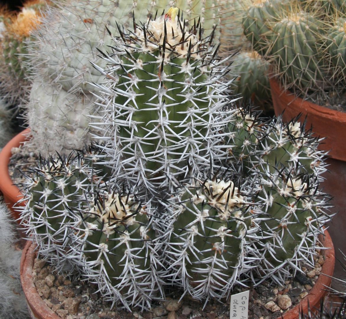 Beschreibung: Copiapoa echinoides wächst einzeln oder dichte Polster bildend. Die grünen Triebe sind festfleischig und kugelig geformt. Ihr Scheitel ist etwas abgeflacht und wollig. Sie messen 7 bis 18 Zentimeter im Durchmesser. Die 11 bis 18 Rippen sind gestutzt. Die Areolen sind gelblich, im Alter vergrauend. Die Dornen sind kastanienbraun bis schwarz gefärbt. Sie sind gerade bis wenig aufwärts gebogen. Es sind bis zu drei Mitteldornen von 1 bis 3 Zentimeter Länge und sechs bis zehn Randdornen vorhanden.